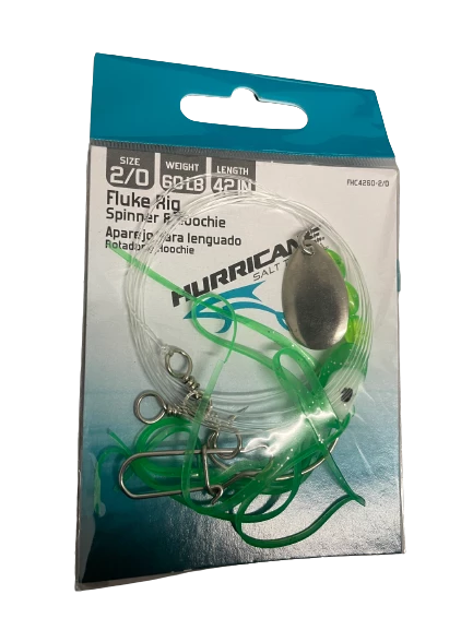 Hr. sprig grin hoochie 2/0hk60# •2/0 nickel wide gap hook •42in 60lb monofilament leader •spinner, Red mirror beads & hoochie to attract fluke •quality Hurricane three way swivel & duo-lock snap there’s nothing like the fishing sport to calm your frazzled nerves or relax on a nice spring day.