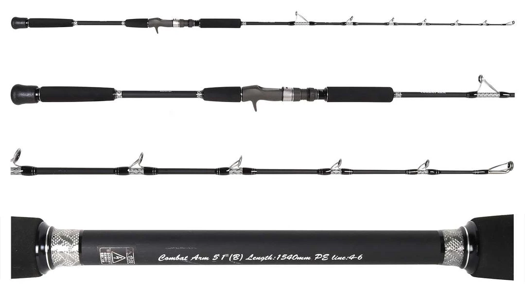 The Centaur Anglers Choice Combat Arm Jigging Rods utilize superior materials and components to perform under the most demanding circumstances. These Japanese style jigging rods offer big fish fighting power in a lightweight, comfortable, and easy to fish package. The Combat Arm series is built on blanks made from imported Japanese Toray carbon, which produces and extremely powerful blank despite their thin profile and light weight. All models feature high-end Fuji components throughout, including Fuji LC and KW series guides. A high strength aluminum alloy gimbal is covered by a removal butt cap for comfortable use with or without a fighting belt (excluded on UL models). Comfortable EVA handles and non-slip Fuji reel seats create a handle configuration that’s comfortable during long drawn out battles with the likes of big tuna, GT’s, amberjack, and more. The stealthy matted black finish and woven accents offer a unique styling usually only seen on custom rods.