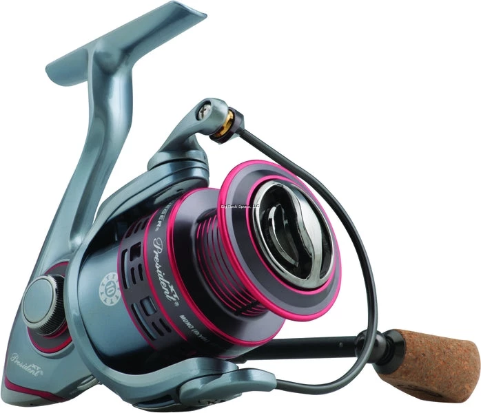The President XT® spinning reels take the President® to the next level of performance. These lightweight reels are ultra-fast thanks to a high-speed gear ratio. They also feature an aluminum main shaft, aluminum pinion gear, sealed drag, carbon fiber handle and a rubber cork knob. FEATURES 10 bearing system 20 size reel is a 7 ball bearing system Aluminum main shaft Aluminum pinion gear Braid ready spool Sealed drag system Rubber cork knobs