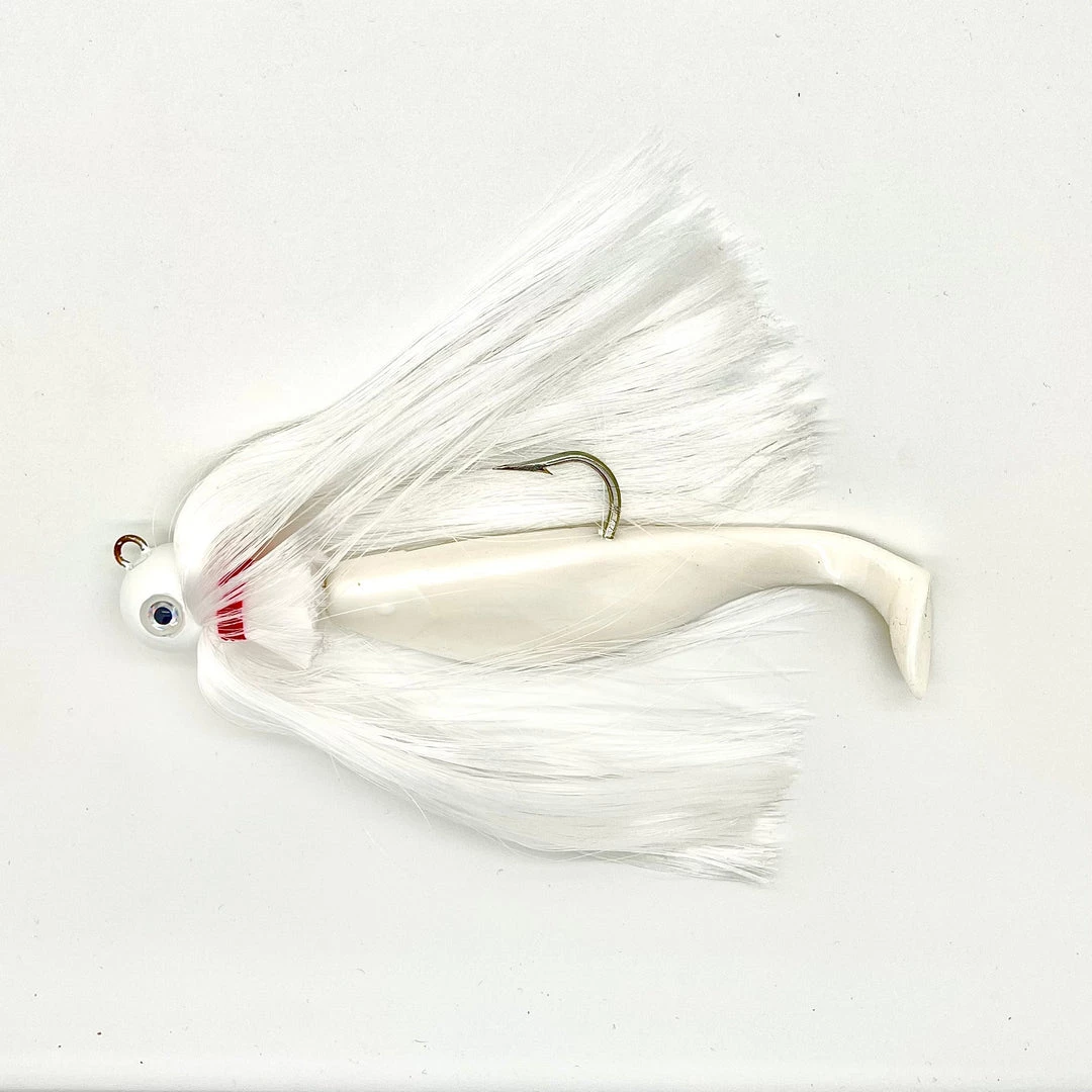 Mojos are magic!  One of the best lures to troll for striped bass off the east coast.  Troll as a solo lure or as part of a tandem rig, these mojo jigs come in sizes from 2 ounces to 32 ounces, and in two colors, white or chartreuse. Round lead heads with eyes rigged with a quality Mustad hook, nylon parachute skirt, and a soft plastic swim shad.