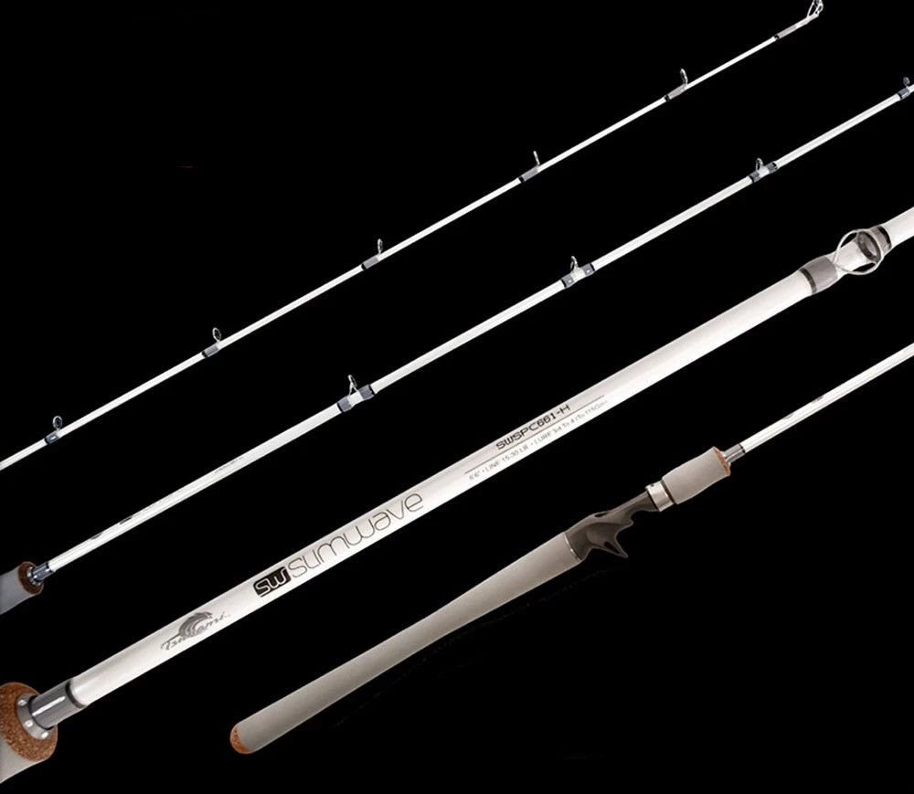 Tsunami Slim Wave Casting Rods are constructed of a super resilient nano carbon for strength and weight reduction. They have been outfitted with Fuji O aluminum-oxide guides, a Fuji graphite reel seat with trigger and stainless hoods and a custom EVA grips. The reargrip has been split to further reduce weight.