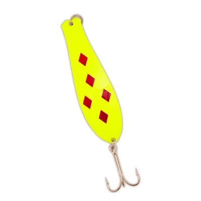 Its unique design allows this spoon to be fished at almost any speed with deadly results. This double action spoon allows you to attach the hook to the large end for a wide, sweeping action and mid-depth running.
